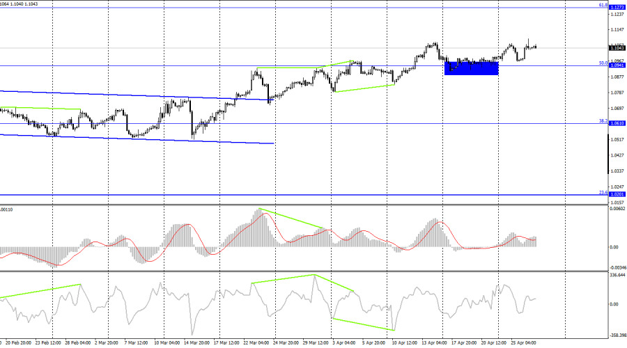 EUR/USD. 27 апреля. Евро продолжает пробивать себе путь наверхИнстаФорекс - Instaforex, 2 года назад Добрый день, уважаемые трейдеры! Пара EUR/USD в среду выполнила новый разворот в пользу европейской валюты и сильный рост. Выполнено закрытие над уровнем коррекции 100,0%, 1,1035, однако к концу дня котировки вернулись к нему. Отбой от этого уровня вновь позволит трейдерам рассчитывать на рост в направлении уровня 1,1105. Закрытие под ним – сработает в пользу доллара США и некоторого падения. Информационный фон для пары остается достаточно слабым. Он совершенно не соответствует силе движений, которые пара показывает в последние два дня. Несмотря на то что европейская валюта успевает и мощно падать, и не менее мощно расти, все-таки трейдеры-быки удерживают инициативу в своих руках. Их поддерживают регулярно поступающие «ястребиные» заявления от членов ЕЦБ о том, что процентная ставка будет продолжать повышаться. Только на этой неделе прозвучали фразы «ставка будет расти до тех пор, пока не начнут снижаться темпы роста зарплат и базовой инфляции» и «ставка ЕЦБ в мае может быть увеличена на 0,50%». Хоть я и считаю, что ЕЦБ замедлит темпы ужесточения ДКП до 0,25%, рынок пока не полностью уверен в этом. Таким образом, европейская валюта растет, растет очень размашисто, но при этом достаточно медленно. Всю прошлую неделю пара топталась на одном месте, но на этой неделе активности трейдерам не занимать. Однако частые откаты и коррекции не сбивают с пути быков. Как бы им ни противостояли сейчас медведи, пара уверенно движется вверх и за полтора месяца прибавила около 550 пипсов. Экономические отчеты отыгрываются очень редко, а различные выступления крупных чиновников США и Евросоюза не дают четкого повода считать, что трейдеры реагируют именно на них. Вчера стало известно, что перед Америкой вновь возникает проблема госдолга, но уже сегодня поступила информации о повышении лимита Конгрессом. Вчера доллар падал, сегодня – не растет. Следовательно, вчерашний рост котировок не был связан с проблемой госдолга и выступление Йеллен. На 4-часовом графике пара выполнила закрепление над боковым коридором, что позволяет рассчитывать на продолжение роста в направлении уровня коррекции 61,8%, 1,1273. Над уровнем коррекции 50,0%, 1,0941, также удалось выполнить закрепление, что повышает шансы на дальнейший рост. «Бычья» дивергенция у индикатора CCI аналогично сработала в пользу евро. Новых назревающих дивергенций пока не наблюдается. Отчет Commitments of Traders (COT):