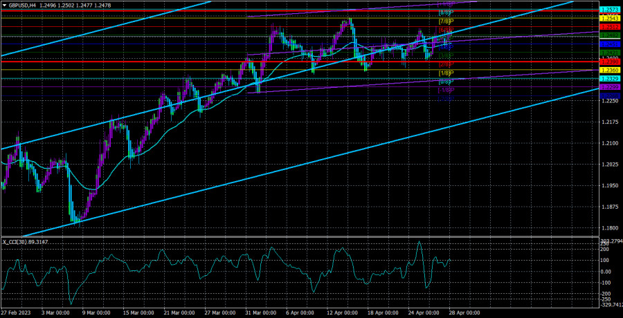 Обзор пары GBP/USD. 28 апреля. Скучное завершение скучной недели и месяца.ИнстаФорекс - Instaforex, 2 года назад Валютная пара GBP/USD продолжает находиться в абсолютном флэте. Уже больше трех недель. Поэтому любые движения внутри этого флэта являются рэндомными по умолчанию. Во вчерашних движениях логику вообще не имеет смысла искать. В статье по евровалюте мы уже говорили о том, что текущие движения нет смысла пытаться обосновать при помощи макроэкономики или фундамента. Вот еще одно доказательство наших слов: британский фунт вчера на тех же самых новостях показал волатильность 63 пункта и абсолютно флэт, даже внутридневной. Таким образом, просто невозможно сделать вывод, что рынок отработал отчет по ВВП США. Логично или нелогично, это даже неважно. Мы увидели минимальный всплеск эмоций во время публикации(как для 4-часового ТФ), на этом все и закончилось в ближайшие 15 минут. Таким образом, по фунту остается только ждать завершения флэта. Открывать сделки на 4-часовом ТФ сейчас не имеет никакого смысла. Торговать следует на самых младших ТФ, где можно поймать хоть какие-то движения. О перспективах фунта было сказано уже очень много, пока тот находился в боковом канале. На иллюстрации выше отлично видно, что пара уже полтора месяца не может толком скорректироваться при том, что макроэкономическая статистика из Великобритании в большинстве случаев разочаровывает. Кто-то из аналитиков может сказать, что в Америке сейчас дела идут тоже не самым лучшим образом, и будет прав. Однако американская экономика последние три квартала растет, при чем темпами гораздо выше британских. Британский ВВП уже давно балансирует на грани 0%, инфляция зашкаливает и никак не реагирует на все старания Банка Англии, сам же регулятор уже в марте мог взять паузу в ужесточении монетарной политики. Как такой фон может провоцировать рост британской валюты? При чем даже без коррекций? Факторов росту у фунта по-прежнему нет.На этой неделе с Туманного Альбиона мы так и не получили ни одного отчета или события. Складывается ощущение, что рынок уже перешел в режим ожидания заседаний ФРС и Банка Англии. Однако от ФРС ждать сейчас особо нечего. Все знают, что ставка вырастет на следующей неделе еще на 0,25%, а потом с вероятностью 90% будет взята пауза. С Банком Англии вилка возможных вариантов немного шире. Британский регулятор может поднять ставку на 0,25%, а может взять паузу после 11 ужесточений подряд. Но заседание БА пройдет лишь через 2 недели, вряд ли рынок сейчас готовится к нему. В любом случае при самом «ястребином» сценарии оба ЦБ повысят ставки на 0,25%. Поэтому никакого преимущества у фунта нет. Мы по-прежнему считаем, что рано или поздно фунт рухнет вниз. Мы уже давно ждем сильную коррекцию и не понимаем, почему она еще не началась. Если брать среднесрочную перспективу, то серьезных факторов роста нет ни у фунта, ни у доллара. Оба ЦБ близки к моменту, когда ставки перестанут расти. Но так как нормальной коррекции мы так и не увидели, то падение более вероятно. На 24-часовом ТФ вполне можно увидеть сохранение трехмесячного флэта. Пара закрепилась чуть выше бокового канала 1,1840-1,2440, но это закрепление настолько неубедительное, что ожидать дальнейшего роста очень сложно. Мы вообще не видим сейчас ни одного фактора в пользу британской валюты. Пара перекуплена, индикатор CCI заходил в обла