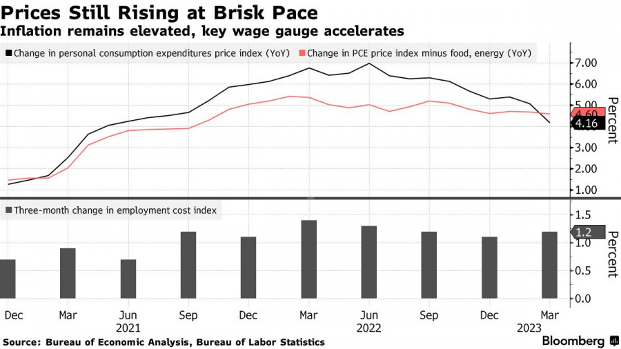 Высокое инфляционное давление вынуждает ФРС и дальше повышать ставкиИнстаФорекс - Instaforex, 2 года назад Евро и фунт отреагировали снижением на новости о том, что два ключевых инфляционных индикатора указали на сохранение давление в США в последние месяцы, подкрепив доводы в пользу нового повышения процентной ставки Федеральной резервной системы на следующей неделе. Индекс цен на личное потребление без учета продуктов питания и энергии, предпочитаемый ФРС показатель базовой инфляции, вырос на 0,3% в марте по сравнению с предыдущим месяцем и на 4,6% по сравнению с годом ранее. В отчете министерства торговли также сказано, что показатель затрат на занятость, за которым также внимательно следит ФРС, вырос на 1,2% в первом квартале по сравнению с предыдущим периодом, превысив прогнозы экономистов. Напомню, что основной целью ФРС является уровень в 2%, который измеряется при помощи более широкого показателя, но регулятор рассматривает базовый показатель, как лучший индикатор тенденции. Данные о ценах, особенно в сочетании с ростом стоимости рабочей силы, подтверждают ожидания того, что политики ФРС продолжат повышать процентные ставки, подняв их еще на четверть процентного пункта на заседании на следующей неделе. Положительным моментом в отчете PCE стало замедление темпов роста стоимости услуг. Так, цены на услуги, за исключением жилищных, выросли в марте лишь на 0,2%. Тем не менее, в годовом исчислении показатель остается повышенным на уровне 4,5%. Но несмотря на это, существует опасение, что устойчивая инфляция в сфере услуг, отчасти вызванная сильным ростом заработной платы в этих отраслях, рискует сохранить рост цен выше целевого показателя ФРС в обозримом будущем. Что касается дальнейших ориентиров, так как очевидно, что на заседании 2-3 мая ФРС повысит ставки, многие ожидают, что затем регулятор возьмет длительную паузу, однако последние данные позволяют сохранить более агрессивный подход, чем может воспользоваться комитет уже на следующей неделе. Расходы на личное потребление, скорректированные с учетом цен, в прошлом месяце остались без изменений, отражая сокращение расходов на товары и умеренные расходы на услуги после пересмотренного в сторону понижения показателя на 0,2% в феврале. Сокращение потребительских расходов свидетельствует о том, что домохозяйства становятся более осторожными и сокращают покупки. Что касается доходов, то они выросли на 0,3%. Заработная плата без поправки на инфляцию также выросла на 0,3% за месяц. Норма сбережений подскочила до 5,1% - самого высокого уровня с конца 2021 года. Что касается технической картины EURUSD, то у быков остаются все шансы на продолжение роста. Для этого нужно оставаться выше 1.1000 и забирать под контроль 1.1030. Это позволит выбираться за пределы 1.1060. Уже от этого уровня можно забраться на 1.1100. В случае снижения торгового инструмента, лишь в районе 1.1000 я ожидаю каких-либо действий со стороны крупных покупателей. Если там никого не будет, было бы неплохо дождаться обновления минимума 1.0960, либо открывать длинные позиции от 1.0940. |