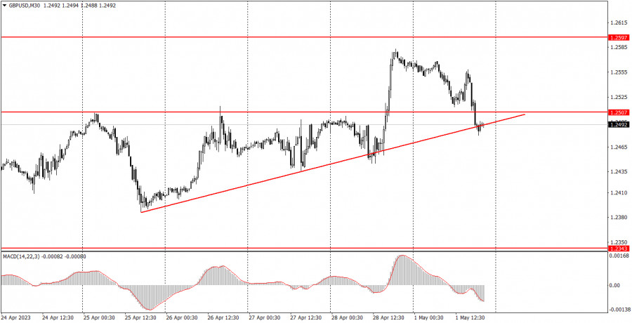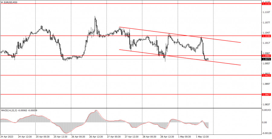 Макроэкономической статистики во вторник будет достаточно много. Первым будет опубликован отчет по розничным продажам в Германии, который имеет самый низкий индекс значимости для рынка. Скорее всего, реакция на него будет минимальной или отсутствовать. Далее будет опубликован индекс деловой активности в секторе производства Великобритании за апрель. Тут следует отметить, что индексы деловой активности имеют серьезное значение для британского фунта, но, как и всегда, требуется, чтобы фактическое значение отличалось от прогнозного, чтобы увидеть реакцию рынка. Скорее всего, индекс упадет еще сильнее, поэтому фунт тоже может упасть завтра утром. Далее будут опубликованы уже по-настоящему важные отчеты. Инфляция в Евросоюзе за апрель будет иметь огромное значение в преддверии заседания ЕЦБ, результаты которого будут оглашены уже в четверг. Если инфляция(как прогнозируется) поднимется до 7% или остается не прежнем уровне 6,9%, это может сильно помочь евровалюте, так как немного повысит вероятность повышения ставки ЕЦБ в четверг на 0,5%. Мы считаем, что ставка в любом случае вырастет только на 0,25%, но важно, как интерпретирует этот отчет рынок, а не мы. Отчет по количеству открытых вакансий JOLTs в США тоже имеет важное значение, так как он отображает состояние рынка труда. Если количество вакансий будет сильно меньше прогноза, это может надавить на позиции американской валюты. Разбор фундаментальных событий: