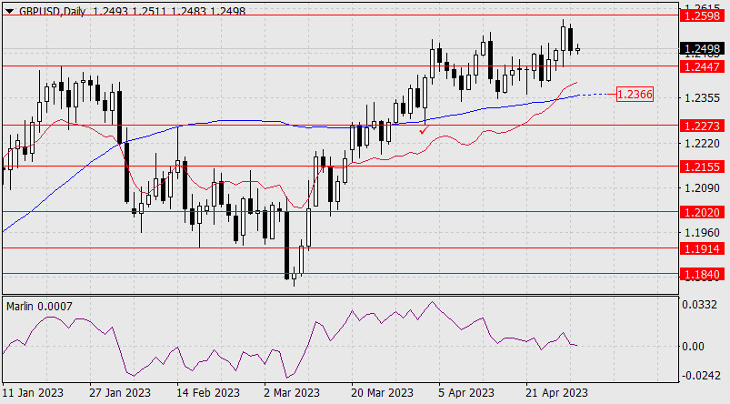 Прогноз по GBP/USD на 2 мая 2023 годаИнстаФорекс - Instaforex, 2 года назад GBP/USD Цена во время этой операции отработает поддержку 1.2447. Её преодоление откроет цель 1.2366 – индикаторную линию Крузенштерна дневного масштаба и минимум 21 апреля. Преодоление линии Крузенштерна откроет новую цель – 1.2273. От этого уровня уже вероятна глубокая коррекция либо консолидация.