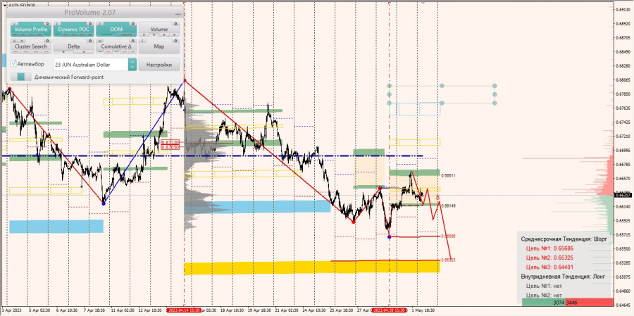 Среднесрочная тенденция: в шорт. Максимальное скопление объемов среднесрочной тенденции расположено в диапазоне по котировкамт0.67050-0.67120. В настоящий момент по паре совершаются инвестиционные операции ниже, указывая на силу продавцов.