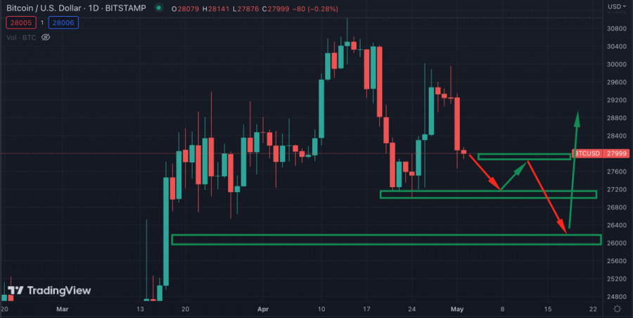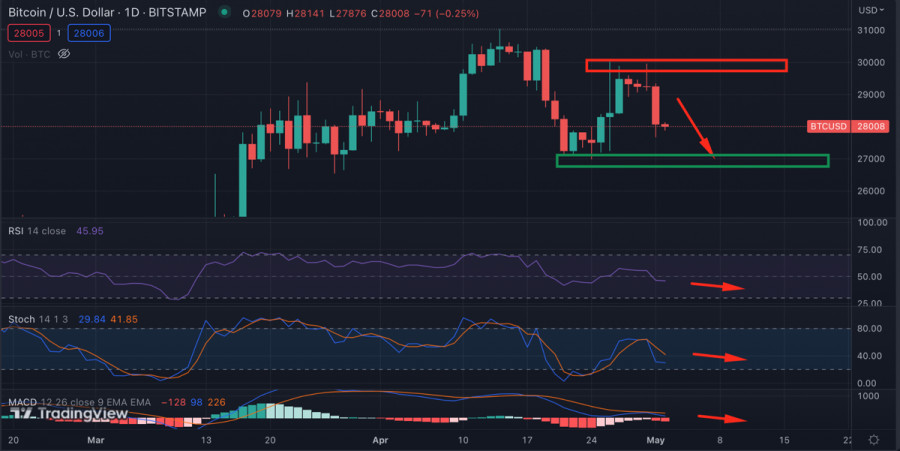Биткоин снижается к $27k на фоне высокой волатильности крипторынка: коррекция продолжится?ИнстаФорекс - Instaforex, 2 года назад Биткоину удалось нарастить 3% капитализации в апреле, однако май криптовалюта начинает по-медвежьи. По итогам вчерашнего торгового дня цифровой актив сформировал крупную красную свечу, что указывает на преобладание продавцов на рынке. BTC совершил нисходящий пробой важного уровня накопления $28,5k. Актив продолжает нисходящее движение и среди ближайших целей стоит выделить уровни $27k и $28k. Быки не сумели развить импульсный рост на прошлой неделе до полноценного бычьего тренда, вследствие чего цена развернулась в сторону нижней границы диапазона. Волатильность и заседание ФРСОсновной причиной локального доминирования медведей на данном участке движения цены BTC стал растущий уровень волатильности. Несмотря на то что быки также обладали высоким потенциалом, неудачный ретест уровня $30k усилил позиции продавцов и цена отправилась на ретест нижней границы канала. Всплеск волатильности был спровоцирован приближением публикации важной экономической статистики в США. Среди ключевых дат стоит выделить 3 мая, когда ФРС примет решение касательно процентной ставки доллара США. По состоянию на 1 мая показатель составлял 5% и финансовые рынки уверены в повышении на 0,25%. В случае, если данные окажутся лучше ожиданий, то доллар США укрепится, в то время как Биткоин и высокорисковые активы продолжат снижение. Рынки закладывают 85%+ вероятность повышения ставки, а потому текущее снижение BTC является предварительной реакцией на завтрашние события. Схожая ситуация происходила в апреле, но тогда криптовалюта немного выросла в цене. Помимо ключевой ставки, на текущей неделе будут опубликованы важные данные по рынку труда США. Институция остается устойчивой к повышениям ставки, что развязывает руки ФРС в дальнейшем повышении показателя, и негативно влияет на BTC. При росте безработицы и количества вакансий, Bitcoin получит "подпитку", так как слабость рынка труда осуществит давление на ФРС. Анализ BTC/USD30-го апреля Биткоин в последний раз касался уровня $30k после чего актив перешел к фазе коррекции. За последние два дня BTC снизился к уровню $27k за счет активизации продавцов и существенного увеличения объемов торгов. Немаловажным фактором нисходящего движения также является негативный сентимент на рынке. По состоянию на 2 апреля цена криптовалюты достигли уровня $28k, где проходит локальная консолидация. Медведям удалось "заколоть" уровень $27,7k, но впоследствии цена вернулась выше $28k. Нижний фитиль красной свечи указывает на активизацию покупателей вблизи уровня $27,7k. Несмотря на локальный откуп, ситуация полностью контролируется медведями. Технические метрики указывают на дальнейшее снижение цены: RSI и стохастик продолжают нисходящее движение под уровнем 40. MACD также возобновил снижение и рискует попасть в красную зону, что будет явным медвежьим сигналом. Вероятней всего, что Биткоин продолжит нисходящее движение, так как прошлая коррекция помогла инвесторам собрать ликвидность ниже $27k. Учитывая это, область $26k-$27k станет ключевой целью данного этапа снижения. При этом вполне вероятно, что новый этап падения цены произойдет, когда ФРС примет окончательное решение. ИтогиБиткоин мечется от верхней до нижней границы диапазона колеба