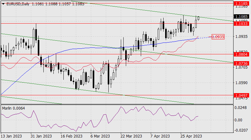 По итогу вчерашнего заседания FOMC ФРС была поднята ставка на ожидаемые 0,25%, но риторика против нашего ожидания не оказалась жёсткой, Комитет всё же объявил о паузе в цикле повышения ставки. Тем не менее, вчерашнего роста евро на 59 пунктов могло и не быть (австралийский и канадский доллары снижаются), ему помогли дополнительные новости: PacWest Bancorp вот-вот обанкротится, а Конгресс не продвинулся в вопросе повышения потолка госдолга.