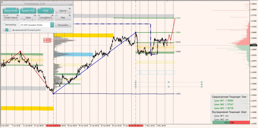 Среднесрочная тенденция: в лонг. Максимальное скопление объемов среднесрочной тенденции расположено в диапазоне по котировкам 1.36150-1.36290. В настоящий момент по паре совершаются инвестиционные операции ниже, указывая на слабость покупателей.