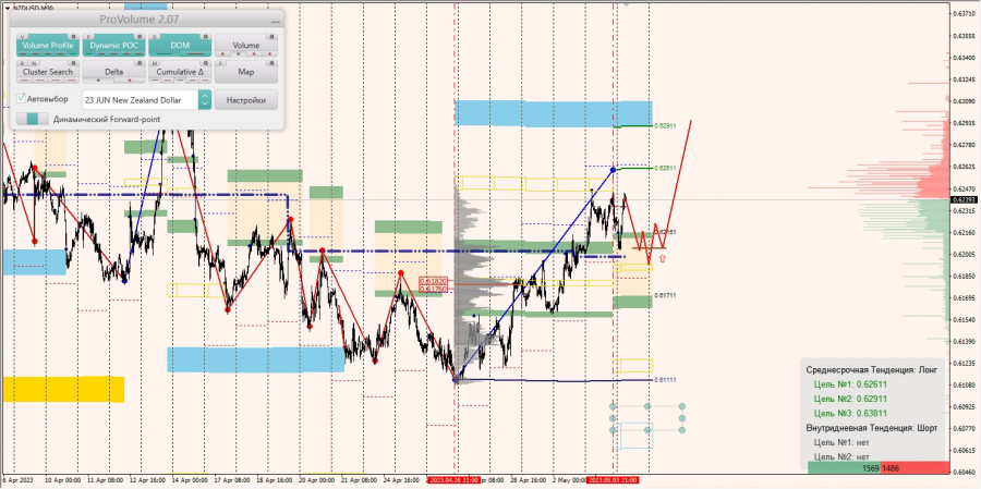 Среднесрочная тенденция: в лонг. Максимальное скопление объемов среднесрочной тенденции расположено в диапазоне по котировкам 0.61760-0.61820. В настоящий момент по паре совершаются инвестиционные операции выше, указывая на силу покупателей.