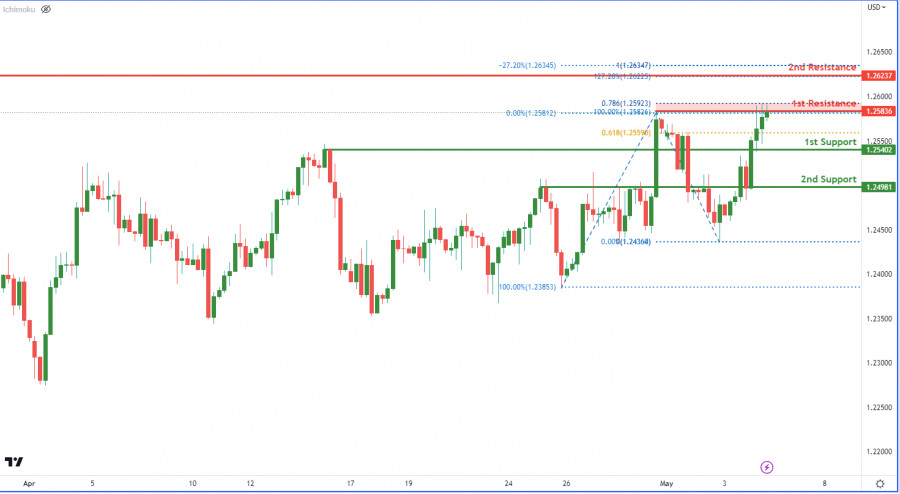 GBP/USD: возможен медвежий разворот. Прогноз на 4 мая 2023ИнстаФорекс - Instaforex, 2 года назад На 4-часовом графике пара GBP/USD развивает медвежий импульс, на что указывает возможный откат от 1-го уровня сопротивления 1.2583 и последующее снижение к 1-му уровню поддержки 1.2540. Первый уровень поддержки может обеспечить поддержку цене в случае ее достижения этого уровня. Если цена опустится ниже 1-го уровня поддержки, дополнительную поддержку может оказать 2-й уровень поддержки на отметке 1.2498. Что касается уровней сопротивления, то 1-й уровень сопротивления 1.2583 является уровнем свинг-хай и совпадает с 78.60% проекцией Фибоначчи. Если цена пробьет этот уровень, она может подняться ко 2-му уровню сопротивления 1.2623, который представляет собой уровень свинг-хай, а также совпадает с уровнями расширения Фибоначчи -27% и 127.20%. Это говорит о том, что цена может столкнуться с сильным сопротивлением в этой области, что указывает на потенциальное ослабление бычьего импульса. Материал предоставлен компанией InstaForex - www.instaforex.com |