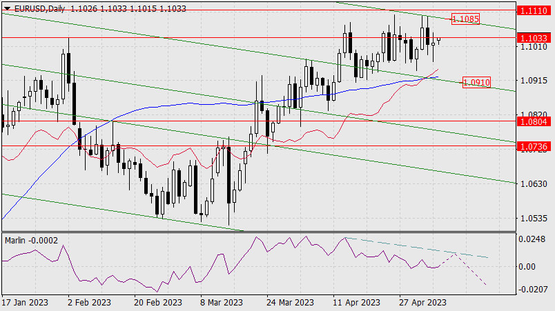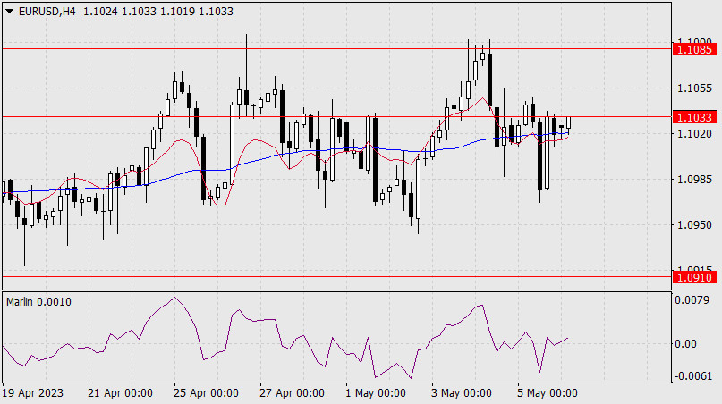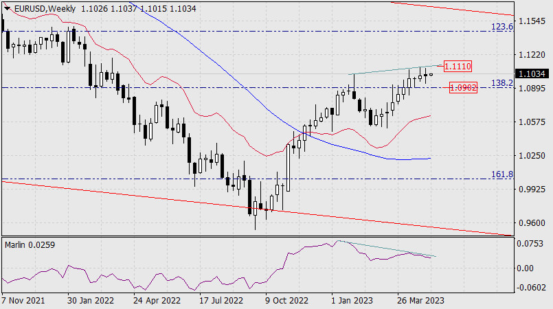 Но пока сигнальная линия осциллятора Марлин, как и неделю назад, удерживается на отрицательной территории, он не растёт вслед за ценой, указывая на слабость растущей тенденции. Нам остаётся ждать либо закрепление нисходящего движения, либо формирования более сильной растущей. Цели роста: 1.1085, 1.1110.