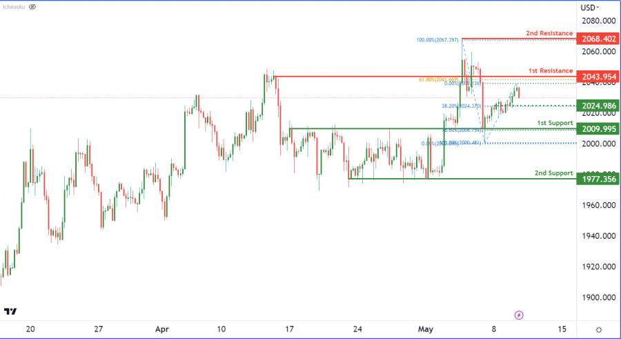 XAU/USD: ожидается дальнейшее развитие нисходящей тенденции. Прогноз на 10 мая 2023ИнстаФорекс - Instaforex, 2 года назад На 4-часовом графике пара XAU/USD развивает медвежий импульс, указывающий на доминирование продавцов на рынке. Цена может продолжить снижение к 1-му уровню поддержки 2009.99, который совпадает с уровнем коррекции Фибоначчи 78.60%. Второй уровень поддержки расположен на отметке 1977.35, которая является уровнем свинг-лоу. С другой стороны, 1-й уровень сопротивления находится на отметке 2043.95, которая совпадает с уровнем коррекции Фибоначчи 61.80%. Второй уровень сопротивления, расположенный на отметке 2068.40, представляет собой уровень свинг-хай. Если цена пробьет 1-й уровень сопротивления, она может подняться ко 2-му уровню сопротивления. Однако общий тренд остается медвежьим, и более вероятным сценарием является продолжение нисходящей тенденции к уровням поддержки. Промежуточный уровень поддержки находится на отметке 2024.98 и совпадает с уровнем коррекции Фибоначчи 38.20%, что может обеспечить временную паузу в нисходящей тенденции. Материал предоставлен компанией InstaForex - www.instaforex.com |