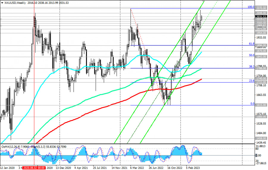 XAU vs. USD: рост и снижениеИнстаФорекс - Instaforex, 2 года назад Безусловным центром внимания инвесторов сегодня является публикация свежих данных по инфляции в США: в 12:30 (GMT) будут опубликованы индексы потребительских цен. Как отметили мы в еженедельном обзоре Важнейшие экономические события недели 08.05.2023 – 14.05.2023, на потребительские цены приходится большая часть общей инфляции. Рост цен заставляет центральный банк повышать процентные ставки для сдерживания инфляции, и, наоборот, при снижении инфляции или признаках дефляции (это, когда покупательская способность денег растет, а цены на товары и услуги падают) центральный банк обычно стремится девальвировать национальную валюту, понижая процентные ставки, чтобы увеличить совокупный спрос. В последнее время из США поступали данные, свидетельствовавшие о замедлении инфляции. Предыдущие показатели CPI с начала года: +0,4% (+5,6% в годовом выражении) в январе, +0,5% (+5,5% в годовом выражении) в феврале, +0,4% (+5,6% в годовом выражении) в марте 2023 года. Нисходящая динамика инфляции в США создает для ФРС предпосылки для замедления или паузы в цикле ужесточения кредитно-денежной политики. Как известно, по итогам заседания, завершившегося в минувшую среду, ФРС повысила процентную ставку на 25 базисных пунктов до 5,25%. В сопроводительном заявлении формулировка о том, что для достижения "достаточно ограничительного" курса может потребоваться дальнейшее ужесточение политики для возвращения инфляции со временем к уровню 2%, была опущена, и "при определении степени целесообразности дополнительного ужесточения политики будут учитываться ужесточения, уже проведенные к настоящему времени, запаздывание политики и другие события". Выступавший чуть позднее глава ФРС Пауэлл попытался сгладить первоначальное негативное впечатление инвесторов от итогов заседания ЦБ, заявив, что «инфляционное давление продолжает оставаться высоким" и "нужно сосредоточиться на снижении инфляции". Однако, его речь не произвела сильного впечатления на участников рынка, и теперь большинство экономистов склоняется к мнению, что это было последнее повышение процентной ставки ФРС в этом году. Более того, они считают, что к концу года ФРС и вовсе перейдет к смягчению своей политики. Доллар остаётся под давлением, учитывая также разногласия в американском Конгрессе по поводу повышения или отмены лимита госдолга США, уже превышающего 31 трлн долларов (президент США Джо Байден требует повысить лимит без каких-либо предварительных условий, а республиканцы настаивают на сокращении бюджетных расходов). При этом глава Минфина США Джанет Йеллен заявляет, что при текущих темпах роста госдолга, и если не будет решена проблема с повышением лимита или его отмены вообще, то проблемы с финансированием работы правительства могут возникнуть уже в начале июня. В текущей ситуации неопределённости осторожные инвесторы предпочитают оставаться в защитных активах, например, в одном из самых популярных, в золоте. Его котировки на прошлой неделе и на следующий день после заседания ФРС подскочили к новому рекордному максимуму 2077.00, обновив максимум марта прошлого года 2070.00. В начале же сегодняшней европейской торговой сессии, найдя поддержку на уровне 2029.00, пара XAU/USD вновь растет после некоторого снижения в ходе азиатской торговой сессии, успев, однако, об