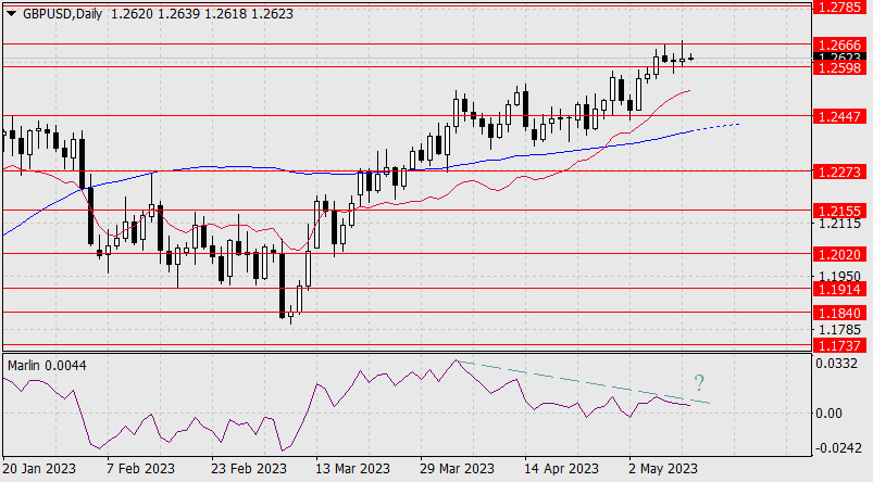 Техническая ситуация усиливает давление на фунт со стороны дивергенции с осциллятором Марлин. Закрытие сегодняшнего дня ниже поддержки 1.2598 позволит цене развить наступление до целевого уровня 1.2447, к которому приближается индикаторная линия Крузеншерна. Закрытие сегодняшнего дня выше 1.2666 открывает цель 1.2785.