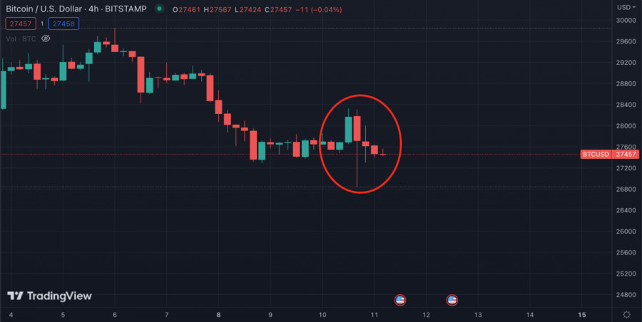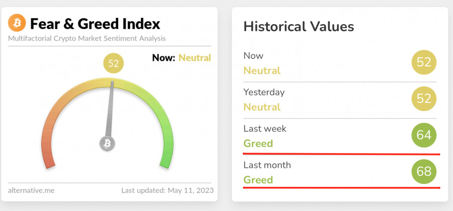 Биткоин удержал $27k на фоне всплеска волатильности: чего ждать от криптовалюты дальше?ИнстаФорекс - Instaforex, 2 года назад Текущую неделю можно назвать медвежьей для Биткоина. Актив снизился к локальной зоне поддержки $28k, а впоследствии продолжил нисходящее движение к важному уровню накопления вблизи $27,5k. При этом наблюдалось постоянное снижение торговой активности и медвежьи сигналы на технических индикаторах. Основной технической причиной этого стал неудачный ретест уровня $30k, который произошел 6 мая. Впоследствии цена криптовалюты совершила разворот к нижней границе текущего диапазона колебаний. Однако за счет скорой публикации данных по инфляции, медведям удалось усугубить ситуацию. Данные по инфляцииБиткоин остается сильно зависимым от макроэкономической ситуации и действий ФРС. Значительное сокращение торговой активности и минимальное движение цены BTC прямо это доказывают. Индекс CPI – ключевой индикатор будущих действий регулятора, а потому его значимость для ценового движения BTC велика. Аналитики прогнозировали, что CPI останется на уровне 5%, даже несмотря на повышение ключевой ставки на 25 б.п. в мае. По итогу показатель инфляции снизился до 4,9%, и, несмотря на локальный позитив, кардинальным образом макроэкономическую ситуацию это не изменило. Рынки ожидают паузу в цикле повышения ставок в июне, что благоприятно скажется на финансовых рынках. Несмотря на позитив, связанный с инфляцией, Центр двухпартийной политики США заявляет, что государство ожидает дефолт по внешнему долгу в начале июня по начало августа. Также S&P Global снизил прогноз по росту ВВП США в 2024 году с 1,5% до 0,9%. Несмотря на это, Goldman Sachs и Bloomberg заявили, что рецессия экономики Штатов в 2023 году все же отменяется. На фоне всех событий индекс доллара США показал локальный рост и сформировал "бычье поглощение". Анализ BTCUSDНа Биткоине все вышеизложенные события отразились неоднозначно. Рынок BTC стал сплошным полем для манипуляций, цена криптовалюты в моменте достигла уровня $28,3k, а впоследствии протестировала область поддержки на $26,8k. Как результат всего за несколько часов было ликвидировано шортов и лонгов на более чем $100 миллионов. По состоянию на 11:00 Биткоин торгуется вблизи уровня $27,5k, а по итогам вчерашнего торгового дня актив сформировал неуверенную свечу "доджи". Технические метрики криптовалюты указывают на очередное снижение торговой активности и движутся по флэту. Однако в целом ситуация остается медвежьей. При этом аналитики Santiment отмечают резкое увеличение коротких позиций по BTC. Последний раз схожая динамика наблюдалась в середине марта, перед началом бычьего ралли криптовалюты до $30k. Вполне вероятно, что погружение ниже $27k только усугубило медвежьи настроения. По состоянию на 11 мая индекс страха и жадности остается в районе нейтральных значений. При этом в недельном и месячном эквиваленте рыночные настроения оцениваются на уровне "жадность". Учитывая это, можно предположить, что коррекция BTC продлится еще какое-то время, пока рыночные настроения не остынут. ИтогиЗа последние две недели Биткоин трижды тестировал зону поддержки $27k. Если следовать правилу, что чем чаще цена тестирует уровень, тем вероятнее его падение, а также объективную необходимость собрать ликвидность ниже $26k-$26,5k, можно ожидать дальнейшее снижение BTC. Это также необходимо дл