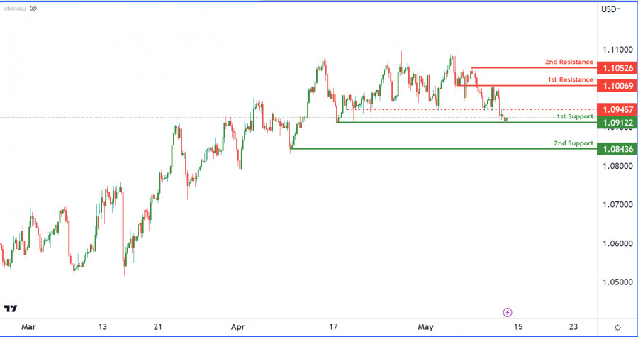EUR/USD: ожидается усиление медвежьего импульса. Прогноз на 12 мая 2023ИнстаФорекс - Instaforex, 2 года назад На 4-часовом графике пара EUR/USD в настоящее время развивает медвежий импульс. Ожидается, что цена прорвется ниже 1-го уровня поддержки и направится ко 2-му уровню поддержки. Первый уровень поддержки расположен на отметке 1.0912 и представляет собой уровень свинг-лоу, который в прошлом служил опорой для ценовых отскоков. Прорыв этого уровня поддержки может привести к снижению до 2-го уровня поддержки 1.0843, который является уровнем свинг-лоу и может остановить дальнейшее падение цены, вызвав отскок. Первый уровень сопротивления находится на отметке 1.1006, которая может помешать бычьему движению цены и развернуть тренд. Между текущей ценой и 1-м уровнем сопротивления расположено промежуточное сопротивление на отметке 1.0945. Пробитие этого уровня может ускорить бычий импульс в направлении 1-го уровня сопротивления. Наконец, 2-й уровень сопротивления находится на отметке 1.1052 и представляет собой уровень свинг-хай. В прошлом этот уровень не раз ограничивал рост цены. Бычий прорыв 1-го сопротивления может подтолкнуть пару ко 2-му уровню сопротивления, но, учитывая общий медвежий импульс, такой сценарий менее вероятен. Материал предоставлен компанией InstaForex - www.instaforex.com |