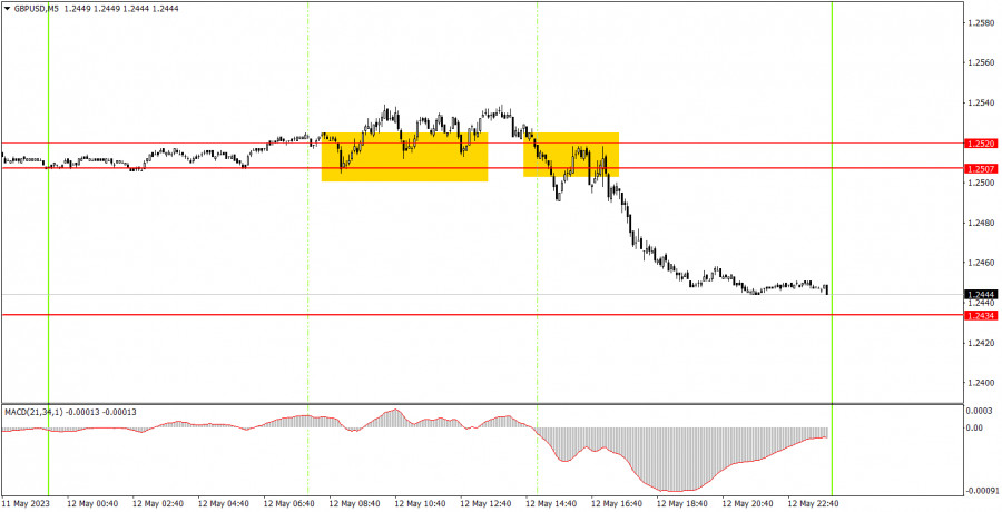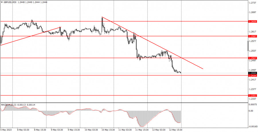А вот фундаментальных событий завтра будет достаточно много. Все – выступления представителей ФРС. В частности, будут выступать Томас Баркин, Рафаэль Бостик, Нил Кашкари. Все трое регулярно делают интересные заявления, а сейчас рынку необходимо быть уверенным в том, что ФРС либо завершила цикл повышения ключевой ставки, либо нет. На этот вопрос трейдеры и будут ждать ответа от вышеперечисленных чиновников. Мы не ждем моментальной реакции рынка на их выступления, но, к примеру, намеки на возможное еще одно или два повышения ставки в 2023 году поддержат доллар в среднесрочной перспективе, так как такие ужесточения монетарной политики не являются запланированными и еще не отработаны рынком. А заявления о том, что ФРС не будет больше повышать ставку, мы вряд ли услышим, так как инфляция находится пока достаточно далеко от целевого уровня, и нет никаких гарантий, что она будет продолжать замедление до конца текущего года. Общие выводы:В понедельник несколько важных событий содержится в календаре, но все они будут иметь «фоновый» характер. Иными словами, сиюминутной реакции рынка на них ждать не приходится. Мы говорим о выступлениях представителей ФРС. А от отчета по промышленному производству в ЕС, в принципе, сложно ждать реакции, максимум на 20-30 пунктов. Поэтому волатильность наверняка снизится, возможен флэт. Основные правила торговой системы:1) Сила сигнала считается по времени, которое потребовалось на формирование сигнала(отскок или преодоление уровня). Чем меньше времени потребовалось, тем сильнее сигнал. 2) Если около какого-либо уровня были открыты две или больше сделки по ложным сигналам, то все последующие сигналы от этого уровня следует игнорировать. 3) Во флэте любая пара может формировать массу ложных сигналов или же не формировать их вовсе. Но в любом случае при первых признаках флэта лучше переставать торговать. 4) Торговые сделки открываются во временной период между началом европейской сессии и до середины американской, когда все сделки должны быть закрыты вручную. 5) На 30-минутном ТФ по сигналам от индикатора MACD можно торговать только при наличие хорошей волатильности и тренда, который подтверждается линией тренда или трендовым каналом. 6) Если два уровня расположены слишком близко друг к другу(от 5 до 15 пунктов), то следует рассматривать их, как область поддержки или сопротивления. Что на графиках:Ценовые уровни поддержки и сопротивления – уровни, которые являются целями при открытии покупок или продаж. Около них можно размещать уровни Take Profit. Красные линии – каналы или линии тренда, которые отображают текущую тенденцию и показывают в какую сторону предпочтительно сейчас торговать. Индикатор MACD(14,22,3) – гистограмма и сигнальная линия – вспомогательный индикатор, который также можно использовать в качестве источника сигналов. Важные выступления и отчеты(всегда содержаться в календаре новостей) могут очень сильно влиять на движение валютной пары. Поэтому во время их выхода торговать следует максимально осторожно или выходить из рынка во избежание резкого разворота цены против предшествующего движения. Начинающим торговать на рынке форекс следует помнить, что каждая сделка не может быть прибыльной. Выработка четкой стратегии и мани-менеджмент являются залогом успеха в трейдинге на длительном промежутке вр