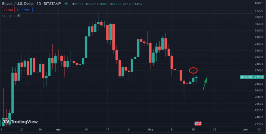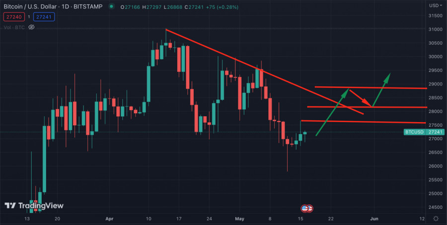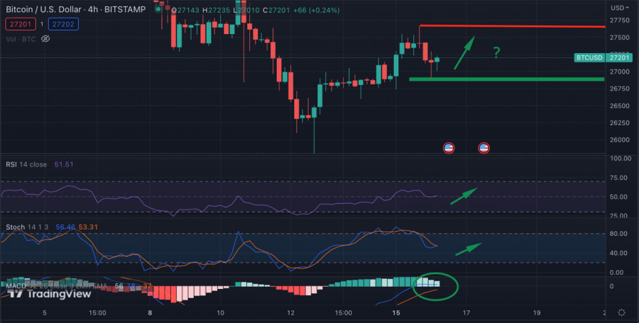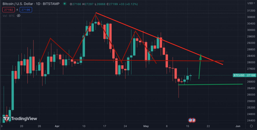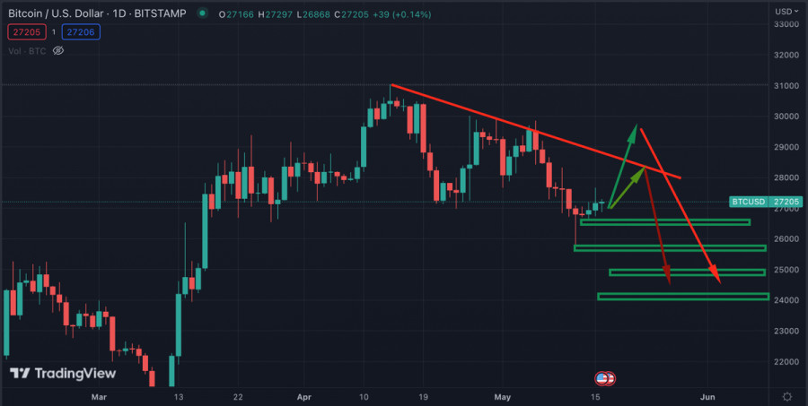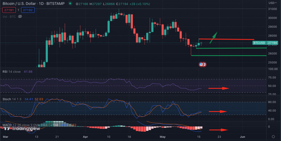 Биткоин приближается к уровню $28,2k: чего стоит ожидать от криптовалюты?ИнстаФорекс - Instaforex, 2 года назад Очередную торговую неделю Биткоин начал на бычьей ноте. Цена криптовалюты в моменте достигала уровня $27,5k, однако закрепиться выше данной отметки не удалось. Впоследствии медведи перехватили инициативу, и BTC вернулся к уровню $26,5k. Несмотря на медвежьи настроения на рынке, актив нащупал локальную зону поддержки вблизи уровня $26,5k. Сильная зона поддержки спровоцировала локальный откат цены, вследствие чего Bitcoin закрепился выше уровня $27k. На данном этапе это движение криптовалюты не стоит воспринимать как сигнал к развороту тренда. Основная цель быков – $28,2kЕсли Биткоин продолжит восходящее движение и преодолеет локальный уровень сопротивления на $27,5k, то активу откроется дорога на $28,2k. Этот уровень – ключевая цель для быков, достижение которой позволит окончательно завершить цикл локальной коррекции. Вблизи уровня $28,2k проходит уровень шеи фигуры технического анализа "голова и плечи", который был полностью отработан на прошлой неделе. Также отметка $28,2k служит мощной зоной сопротивления, где проходит уровень нисходящего тренда от 14 апреля. Тогда цена протестировала уровень $31k и начала снижаться. Учитывая все вышеизложенное, главной задачей быков в ближайшее время станет окончательное завершение медвежьего периода. Для этого необходим бычий пробой и закрепление выше уровня $28,2k-$28,5k. По состоянию на 16 мая необходимого потенциала у быков нет, поэтому стоит ожидать продолжения консолидации. Негативный сценарийЕсли при позитивном варианте развития событий BTCUSD совершает полноценный бычий пробой уровня $28,2k, то при негативном развитии событий может быть несколько сценариев. Цена Биткоина может совершить ложный пробой уровня и вновь опуститься к $26,5k. Также вероятен вариант при котором Bitcoin не сумеет преодолеть отметку $28k. В любом из этих вариантов развития событий вероятность завершения бычьего тренда существенно возрастает. Актив отправится на ретест уровня $25k и продолжит снижение к $24,6k, где находится основание бычьего тренда. При неудачном пробое $28,2k потенциал нисходящего движения BTC достигает отметки $23k. Анализ BTC/USDПо состоянию на 11:00 BTCUSD удалось немного восстановиться в цене и достичь уровня $27,1k. Однако о полноценном закреплении речи не идет, так как на рынке присутствует активный продавец. При этом наблюдается активизация покупателей, которым удалось вытолкнуть цену при очередной попытке снижения. В пятницу, 12 мая, цена криптовалюты обновила локальный минимум на отметке $25,8k. Очевидно, что в ближайшие дни мы будем наблюдать больше бычьих импульсов и попыток "вскарабкаться" на отметке $28,2k. На это намекает растущая сетевая активность, за которой должен последовать рост объемов торгов. На дневном графике технические метрики криптовалюты указывают на флэтовое движение цены. Стохастик и RSI продолжают движение в боковом направлении вблизи уровня 40. При этом MACD вышел за пределы красной зоны, но продолжает снижаться. На 4h графике мы видим первые сигналы к вероятному развитию восходящего рывка. RSI приобрел восходящую направленность, а стохастик сформировал бычье пересечение. MACD зашел в зеленую зону, но сохраняет флэтовое направление. ИтогиВ ближайшие дни мы увидим больше внутридневных ценовых рывков за счет увеличения вол