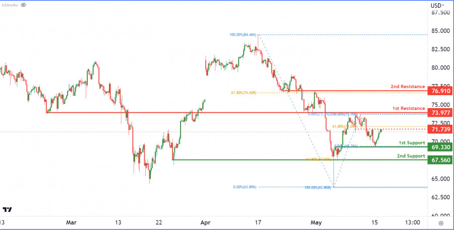 Нефть марки WTI торгуется с понижением. Прогноз на 16 мая 2023ИнстаФорекс - Instaforex, 2 года назад На 4-часовом графике нефть марки West Texas Intermediate (WTI) в настоящее время развивает медвежий тренд. Ожидается, что цена снизится к 1-му уровню поддержки $69,33. Если цена опустится ниже этого уровня, она направится к следующему значимому уровню поддержки, расположенному на отметке $67,56. Уровни сопротивления находятся на отметках $73,97 и $76,91, которые совпадают с уровнями коррекции Фибоначчи и могут помешать росту цены. Кроме того, промежуточное сопротивление на отметке $71,73 может стать незначительным препятствием для восходящего движения цены. Материал предоставлен компанией InstaForex - www.instaforex.com |