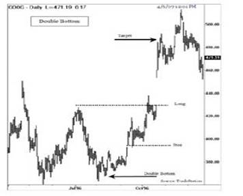 Правила торговли на «двойном основании» «Двойное основание» является зеркальным отражением модели «двойная вершина». Продолжительный нисходящий тренд приводит к формированию новых минимумов, сопровождаемых умеренным ралли от первого основания. После короткого ралли цена пытается вновь протестировать уровень минимума первого основания. Неспособность продвинуться ниже первого основания приводит к формированию второго основания и развороту предыдущего тренда. Промежуточный максимум колебания между двумя основаниями называется «реакционным максимумом колебания». Когда цена продвигается выше этого «реакционного максимума колебания», это сигнализирует о потенциальной возможности торговли в длинную сторону.